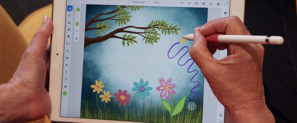 Adobe Fresco är Mette Korsmoe Koverbergs främsta skaparverktyg. Med appen kan Mette arbeta obehindrat i lager med olika färger. Penslarna känns verklighetstrogna. Hon bestämmer dessutom när färgerna ska torka så att hon kan arbeta vidare på sitt projekt, när hon vill.