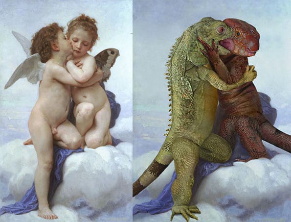 Det är anledningen till att jag då och då, med gott samvete, har använt kända tavlor i mina montage. Som när jag stoppade in ödlor i William Bouguereaus L’Amour et Psyche, enfants. Källbilden är från en amerikansk sida och därmed med största sannolikhet fri för mig att använda.