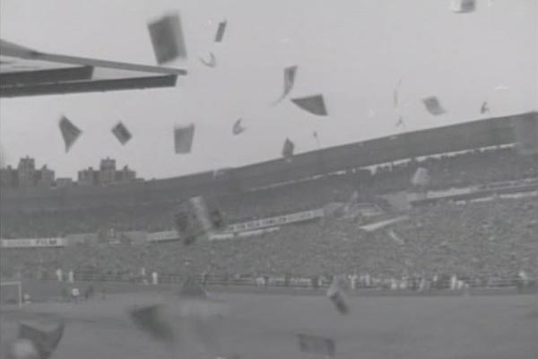 Kurre Hamrin har precis gjort sitt berömda 3-1-mål mot Västtyskland i semifinalen, VM 1958. TV-kameran panorerar ut över helt nybyggda Ullevi i Göteborg som kokar av glädje. Hemmanationen är på väg mot VM-final och programbladen viner i luften. Under ett kort ögonblick skymtar ett par byggnader utanför stadion förbi.