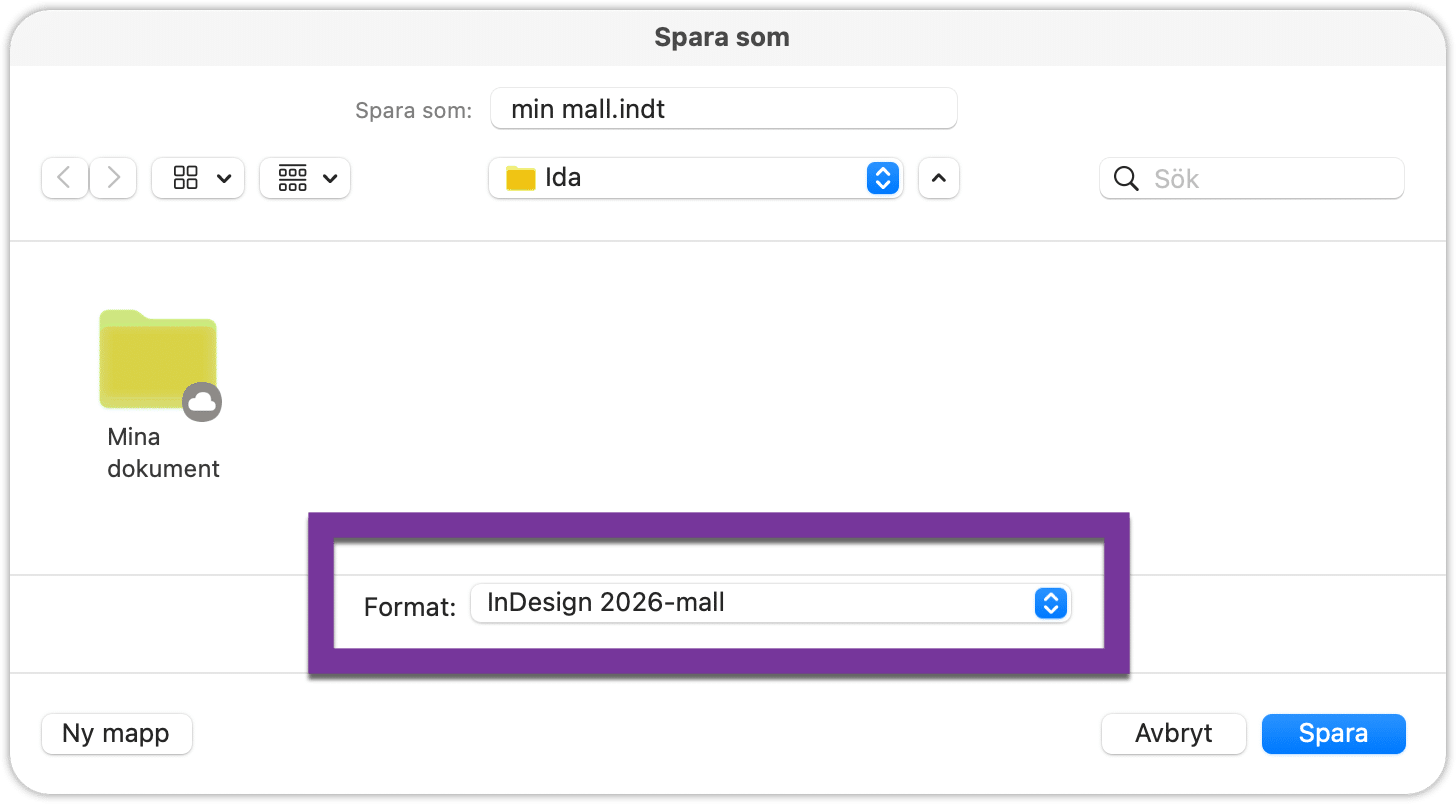 Steg 3 – Välj InDesign 2026-mall som format och spara.